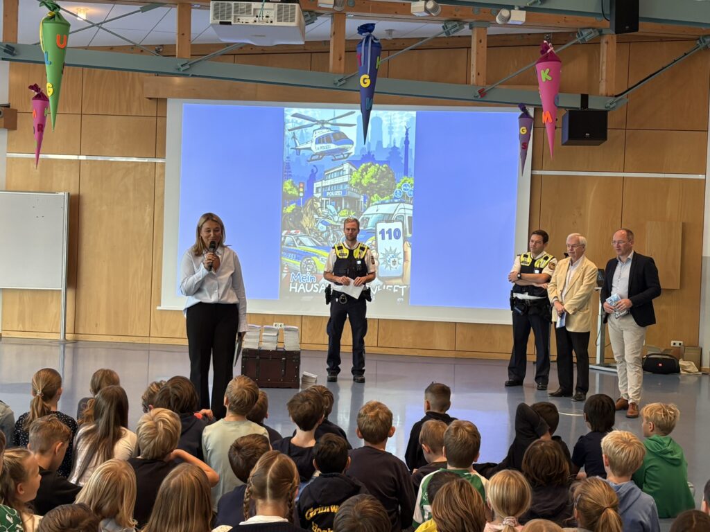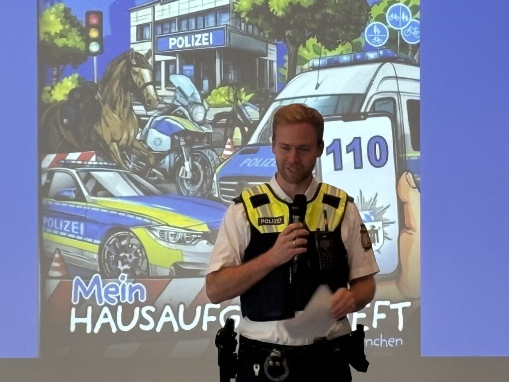 Pünktlich zum Schulbeginn, am 17. September lieferte die Grünwalder Polizei das neue Hausaufgabenheft der Münchner Polizei an die Kinder ihrer Grundschule im Ort aus.